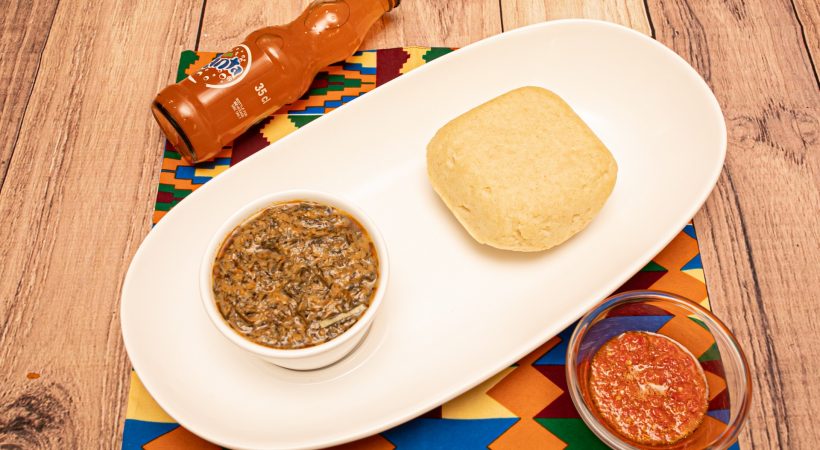 Fufu made with cassava flour, and a bowl of Fumbwa