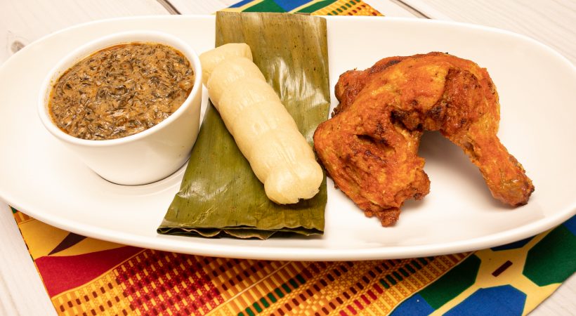 Kwanga with fumbwa and chicken