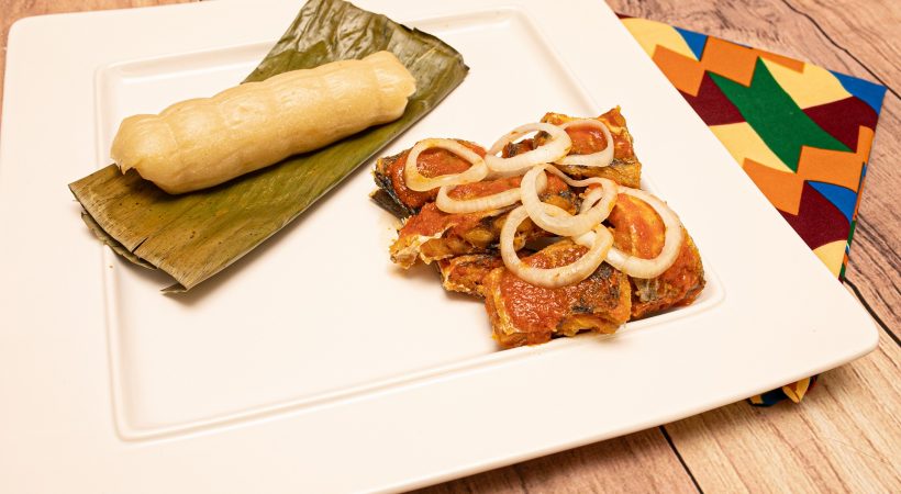Kwanga and salt fish in tomato sauce